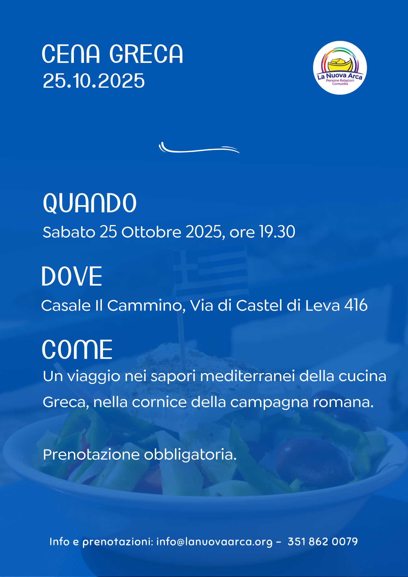 Il contributo per la Cena Greca è di € 30 a persona. Sconto del 50% per bambini dai 2 agli 8 anni.
