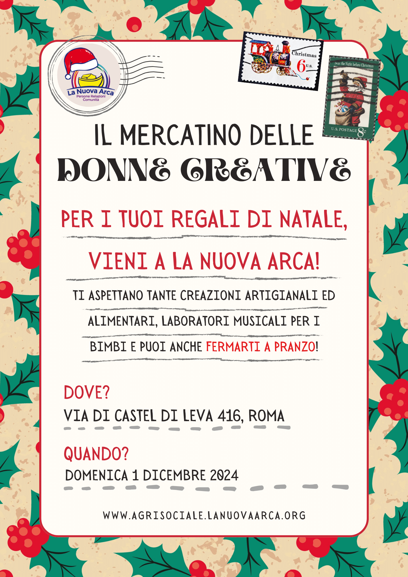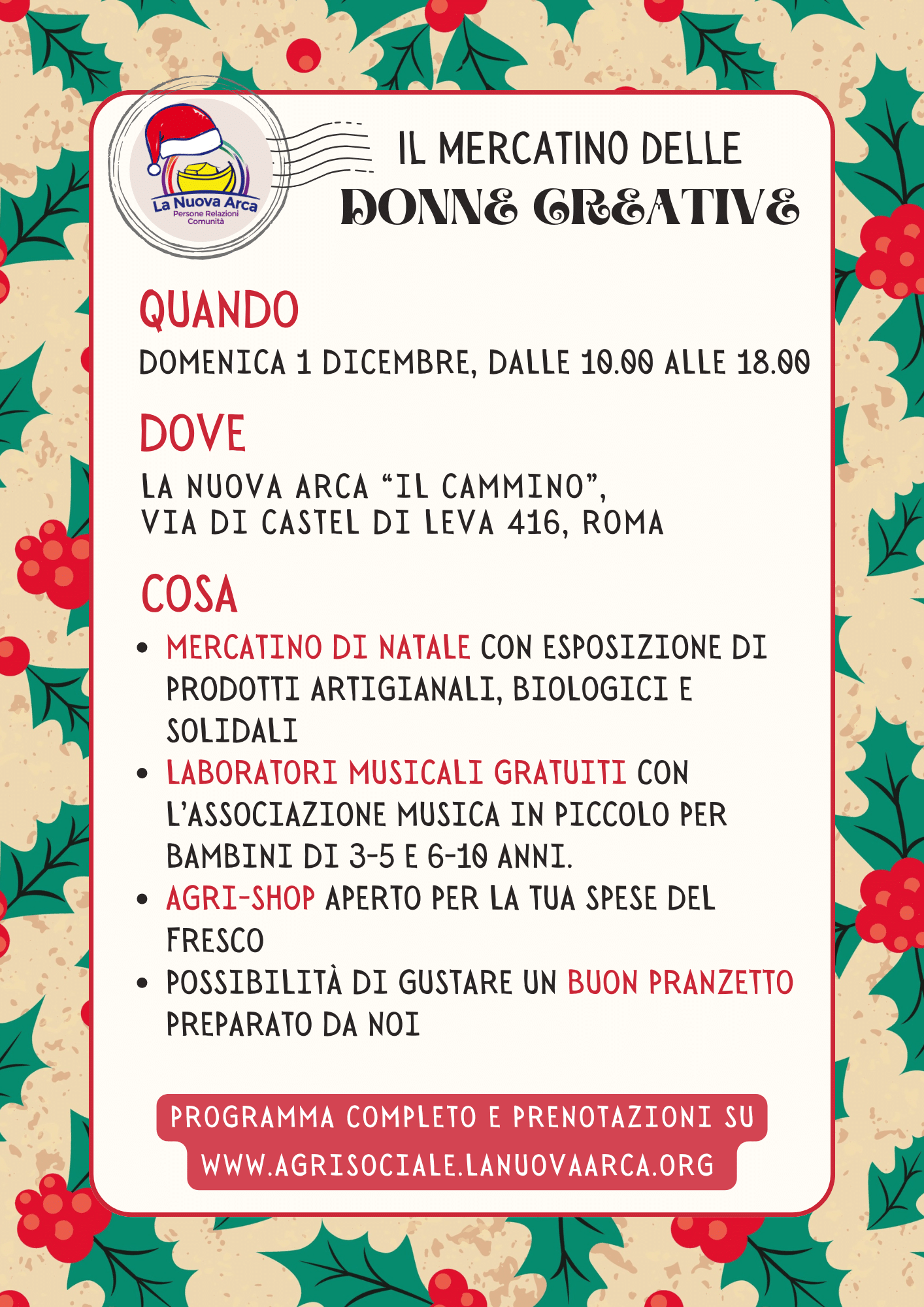 Domenica 1 Dicembre dalle 10.00 alle 18.00, presso la sede de La Nuova Arca in Via di Castel di Leva 416. La sede è dotata di ampio parcheggio interno gratuito.
